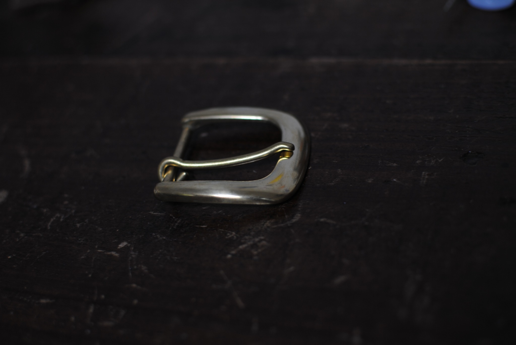 これからベルトを販売するにあたり、バックルが1種類しかもマニアックなミリタリーパンツをイメージしたベルトだけだとさすがに厳しいなと感じていたので、もう1タイプバックルを仕入れました。35mm幅の上品なバックル。一本目のベルトが私のM47へのオマージュだとすると、こちらのバックルは「ベルトのスタンダードを作る」をコンセプトにしています。どの方向にもよっていないニュートラルなベルト。はじめてこのバックルを見たとき、その美しい形に惹かれたのですが、表面がざらざらしていて、質感としては私の目指すものとはほど遠い物でした。そこで、自分でバックルを研磨して艶を出しました。表面がざらついていると薄汚れた感じの経年変化になっていくのですが、つるんとした表面は経年変化によりなんともいえない渋みがでます。はじめはピカピカのバックルが気恥ずかしいのですが、育てがいのある長く付き合えるバックルと言えます。バックルをひとつひとつ磨くのは大変なのですが、このバックルはピカピカのほうが絶対にかっこいいし、このひと手間が愛着に繋がることが分かっているので、念入りに磨いています。