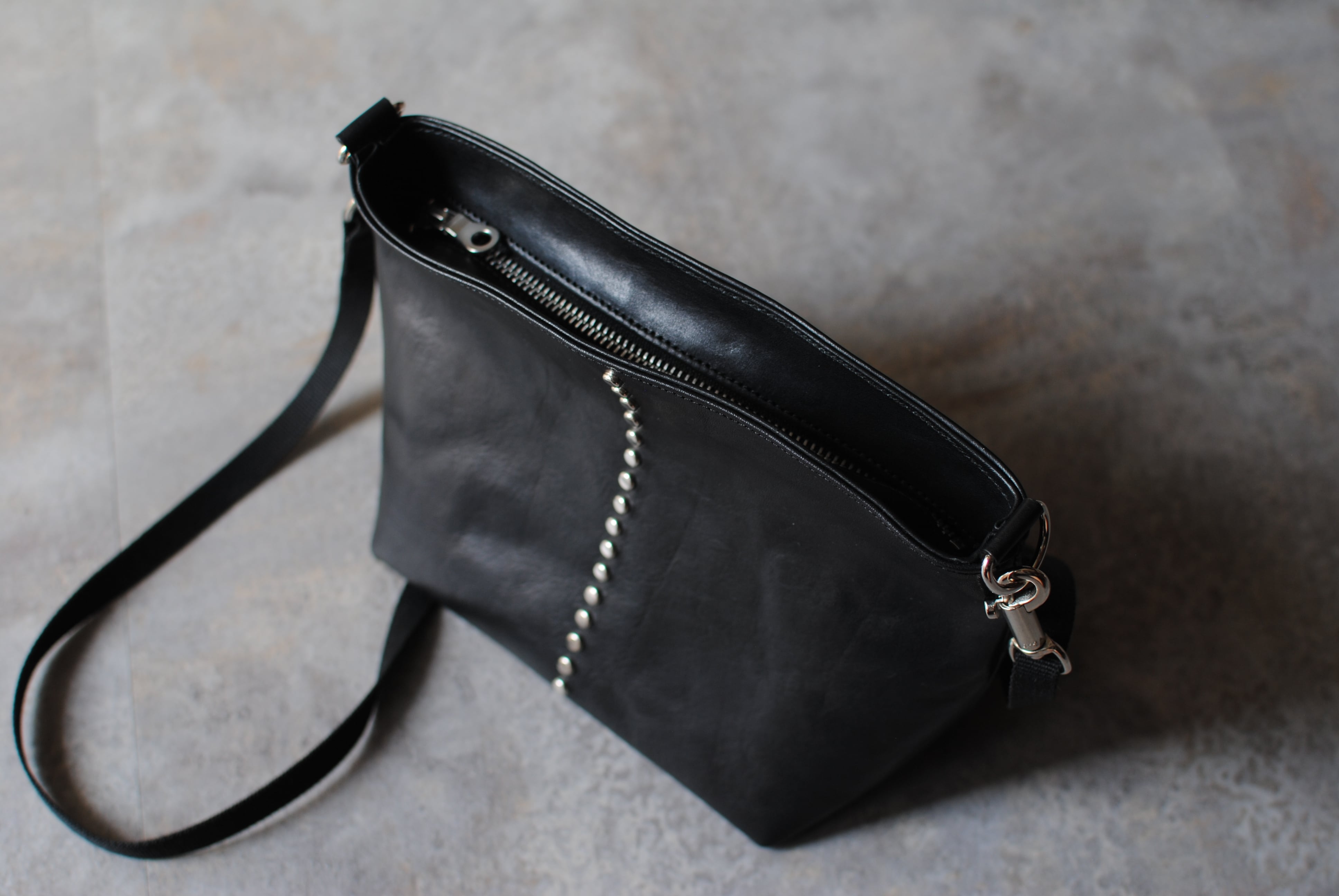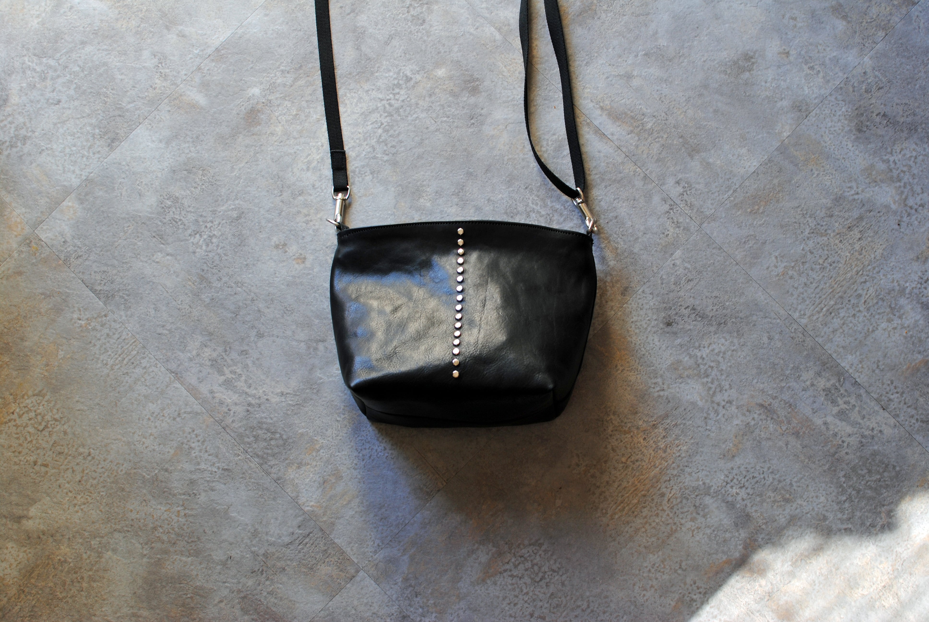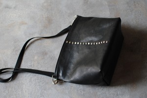 バッグ中央にスタッズを配置し、アクセントにしています。スタッズというとハードなイメージですが、小ぶりでフラットなスタッズは洗練された印象をもたらします。